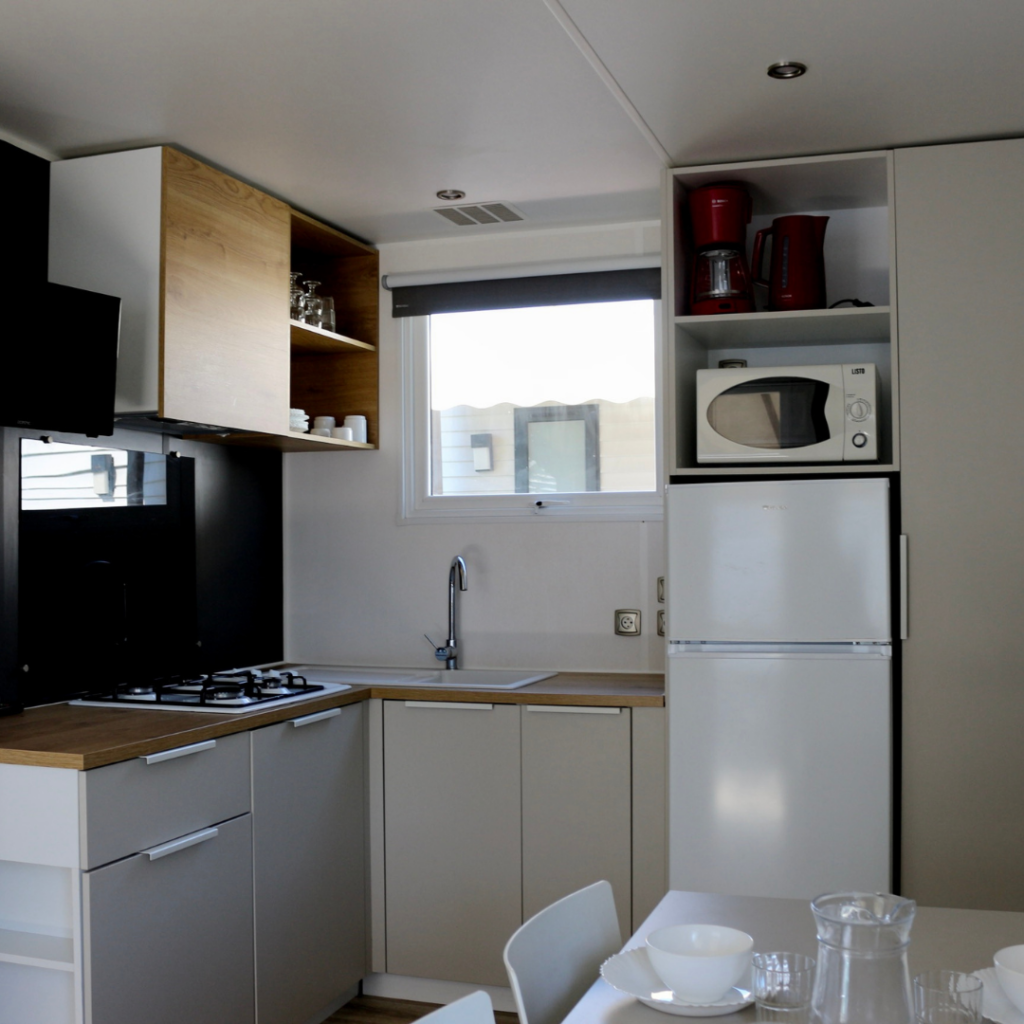 Idéal pour des vacances en famille ou entre amis, notre mobil-home 2 chambres combine confort, espace optimisé et équipements complets pour un séjour réussi au Camping Montpellier Plage.