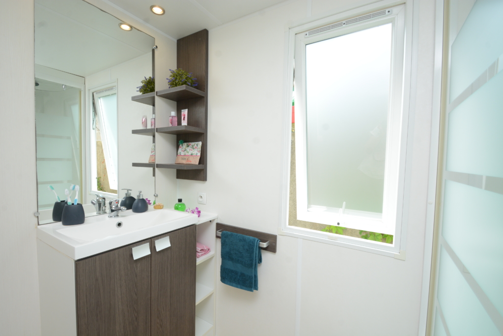 Le mobil-home dispose d’une chambre équipée d’un lit double 140×190 cm avec couette et oreillers inclus.