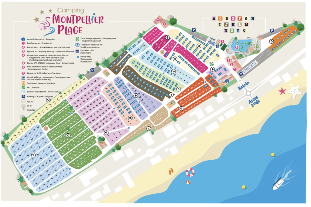 Le camping est organisé en quartiers identifiés par lettres (A à Q) pour une orientation simple et rapide.